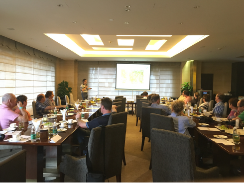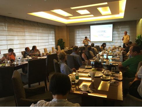 會(huì)上,董事長黃永博士詳細(xì)講解了太抗系列產(chǎn)品的作用機(jī)理及各地應(yīng)用案列,得到了所有與會(huì)人員的高度關(guān)注。當(dāng)講到太抗產(chǎn)品的安全性時(shí),外賓們紛紛將在燒杯中的樣品看了又看,聞了又聞,可能實(shí)在覺得看似酸奶的生物農(nóng)藥著實(shí)稀奇。PPT放映結(jié)束后,外賓們接連提問,關(guān)于產(chǎn)品的保質(zhì)期、使用技術(shù)、投入產(chǎn)出比等等,董事長一一解答,連喝水的空都沒有。其中,來自來自維多利亞州的Gary Jeans講到其種植有4000公頃有機(jī)李用于出口中國,非常希望能用上太抗系列產(chǎn)品!此外,有外賓提出想帶些樣品回澳洲,也有外賓提出想和我公司澳洲研發(fā)人員深入交流,更有外賓要了黃董厚厚一疊名片說是要去澳洲幫我們做宣傳!