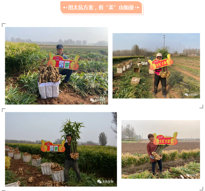 自2016年至今,太抗?產(chǎn)品一直深耕于大姜的各主產(chǎn)區(qū),并且在防病增產(chǎn)、解決大姜的土傳病害上屢立戰(zhàn)功。今年“姜”山如故,太抗?產(chǎn)品依舊光彩熠熠,我們來看一下示范效果吧: